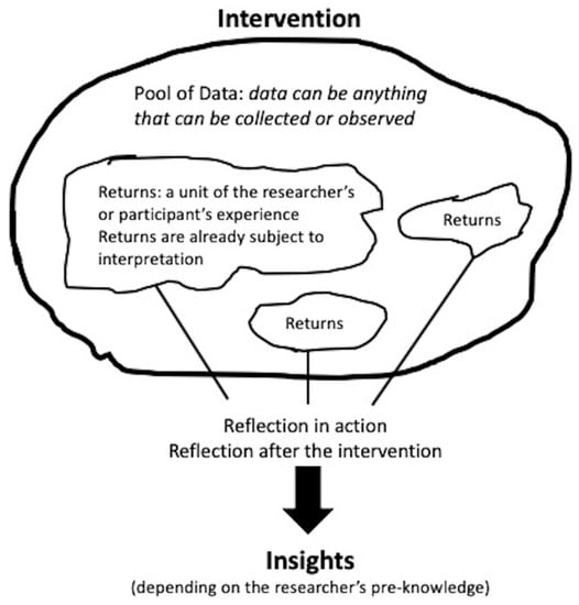 Diagram to visualize the relationship between data and returns. The researcher experienced the pool of data and collected returns whilst applying reflection-in-action and reflection after the intervention to draw out insights.
