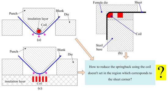 Existing springback reduction methods using magnetic pulse forming: (a) V-shaped part using the coil embedded in the punch, (b) L-shaped part, (c) V-shaped part using inverse magnetic force.