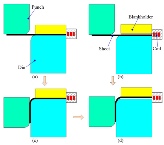 Forming method 1: As shown in Figure 2a,c,d, the sheet is clamped by the blankholder and die during the stamping process. After the quasi-static stamping, the blankholder moves up, and then the coil discharges.