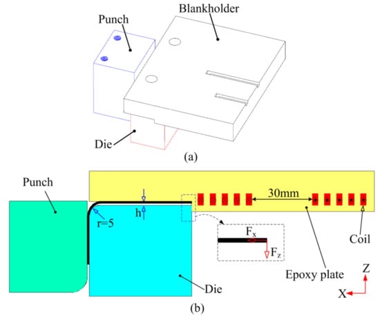 Figure 3 shows the forming device designed according to the forming principles presented in Figure 2b. To reduce the complexity of the forming process, the blank holder and coil were arranged as a single structure. Figure 3a shows the combined three-dimensional (3D) structure of the die and blank holder. The blank holder, as illustrated in Figure 3b, was manufactured using an epoxy plate with a step structure at the bottom. The left side of the flat step was used to press the flange area of the sheet metal, and multiple grooves were created on the right side of the step. The 3 mm × 6 mm copper wire was embedded into the grooves as the discharge coil. The length, width, and thickness of the sheet metal were 90 mm × 40 mm × 1 mm. The main parameters of EMF equipment are as follows: the maximum discharge energy (200 kJ), rated voltage (25 kV), and capacitance (640 μF). To analyze the feasibility of the proposed method, the effect of two process parameters on springback were analyzed: (1) the distance between the blank holder and die, which is defined as h; and (2) the discharge voltage, which is defined as U.