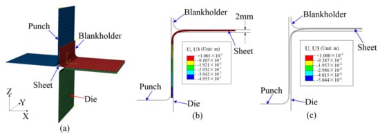 Figure 4 shows the finite element model for quasi-static stamping. For the simulation, the punch, die, and blankholder were all set as a rigid body structure. During the stamping, the blankholder and die were in a fixed position, while the punch moves down 50 mm to bend the sheet. To compare the use of a solid element or shell element on the forming and springback simulation, the metal sheet was modeled using both. The solid element type was C3D8, and the shell element was S4. For the solid element type of the sheet, the number of elements in the thickness is set to 4. For both elements, the simulation was performed assuming a gap of 2 mm between the blank holder and die. The results are shown in Figure 4b,c. The upper surface of the sheet makes adequate contact with the blank holder after quasi-static bending, as shown in Figure 4b.