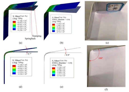 Using the parameters obtained from the stamping experiment, the springback of the sheet metal was simulated using both the solid and shell elements, as shown in Figure 5. The deformation results calculated by Abaqus/Explicit were imported into Abaqus/Implicit to calculate the springback of the metal sheet. Assuming that all parameters remain the same, the springback angle obtained by the experiment was 10° after the metal sheet was bent 90°. The springback angles using the solid element and shell element were 8.8° and 9.9°, respectively. Thus, the springback angle obtained by the shell element has a high accuracy predicted compared to the experimental result. Inconsistencies between the predictions were mainly due to the differences between the elements in the finite element method. Thus, for calculating the springback after sheet forming, the shell element produces better results.