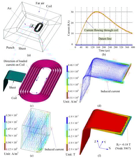 If a metal workpiece is placed in an alternating magnetic field, it will produce an electromagnetic force within a certain range of workpiece thicknesses according to the law of electromagnetic induction. This is referred to as the skin effect. Therefore, solid elements must be used in electromagnetic field simulations. Based on the simulation results presented in Figure 4b, our laboratory has established a three-dimensional electromagnetic field model, as shown in Figure 6a. The entire electromagnetic field model includes five parts: discharge coil, bent sheet metal, punch, near-field air, and far-field air. The coil, sheet, and punch are meshed with SOLID 97 elements and an eight-node hexahedral element. The air that surrounds the sheet and coil is meshed with pyramidal and tetrahedral elements to propagate the magnetic field generated by the coil. The far-field air region is meshed with INFIN110 elements and an eight-node hexahedral element. During the EMF, the current density is loaded into the coil, and the far air flag is load on the exterior surface of the whole finite element model.