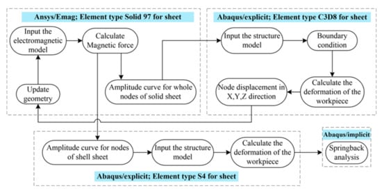 According to Figure 5 and Figure 6, the solid element should be used for magnetic field force calculation during the electromagnetic field simulation. However, large errors occur when calculating the springback angle using the solid element. Therefore, the shell element should be used to more accurately predict springback. The electromagnetic force previously calculated using the solid element electromagnetic field model must be transformed into the equivalent electromagnetic force for the shell element. The simulation process is illustrated in Figure 7. First, the ANSYS/EMAG program was used for magnetic force calculation for each node in the solid element. Then, the magnetic force were imported into the ABAQUS/EXPLICIT program to analyze the sheet deformation, and the updated deformed solid mesh was imported back into the ANSYS EMAG program to calculate the next magnetic force. The magnetic field/structure coupling analysis was realized using the conditions obtained for the solid element. As a result of the shape changes of the metal sheet, the magnetic field was taken into account during each step of the analysis. This ensured the accuracy of the magnetic field force calculation using the solid element.