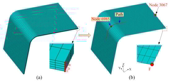 To simulate the forming process shown in Figure 7, a relationship between the solid element nodes and shell element nodes was defined. Using the concept presented in Figure 8 and assuming that Figure 8a represents a solid element after bending, five nodes exist in the sheet thickness direction. The mid-layer shown in Figure 8a was extracted and positioned within the shell element plane, as shown in Figure 8b. This ensured that five nodes on the solid element corresponded to one node on the shell element. Taking the end node of the sheet metal as an example, five nodes along the thickness direction were defined: A, B, C, D, and E. The electromagnetic forces were first obtained along the X, Y, and Z directions of nodes A, B, C, D, and E. Then, the five nodes of the solid element were transformed into a single node F of the shell element. The electromagnetic force expressions for node F in the X, Y, and Z directions are as follows: