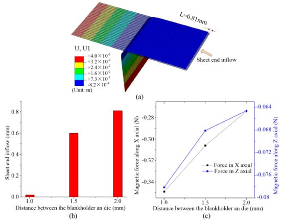 The inflow and magnetic force at node 3067 when U = 5 kV are shown in Figure 9 for various distances between the blankholder and die (h). A smaller distance between the blankholder and die causes the smaller value of sheet end inflow and the larger the magnetic force (Abs) at node 3067.