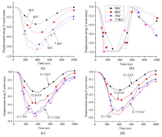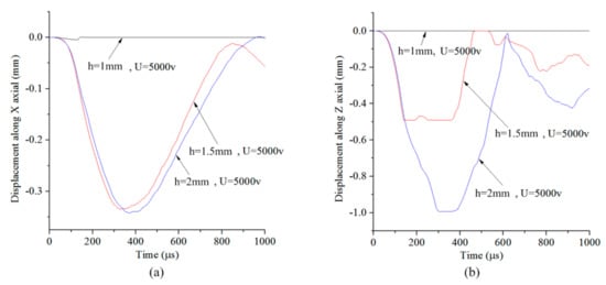 Figure 10 shows the displacement along the X and Z-axis at node 3067 after the coil discharges and U = 5 kV. If the h is set to 1 mm, the sheet end does not move along the Z-axis, and only very small displacements occur at node 3067 along the X-axis. If the h is set to 1.5 mm or 2 mm: (1) Displacement along the X-axis follows the shape of a parabolic curve. From 0 to 1000 μs, node 3067 first moves along the negative X-axis and then along the X-axis. However, differences in the maximum displacement along the X-axis are small if the h is set to 1.5 mm or 2 mm; (2) the sheet end moves first along the negative Z-axis, it comes into contact with the upper surface of the die, and then it moves along the Z-axis again. After 600 μs, the sheet end moves along the negative Z-axis again. From the above analysis, it can be concluded that the sheet end has obvious shake if the distance between the blankholder and die is larger than the sheet thickness. A larger distance between the blankholder and die results in a greater displacement of the sheet end along the Z-axis.