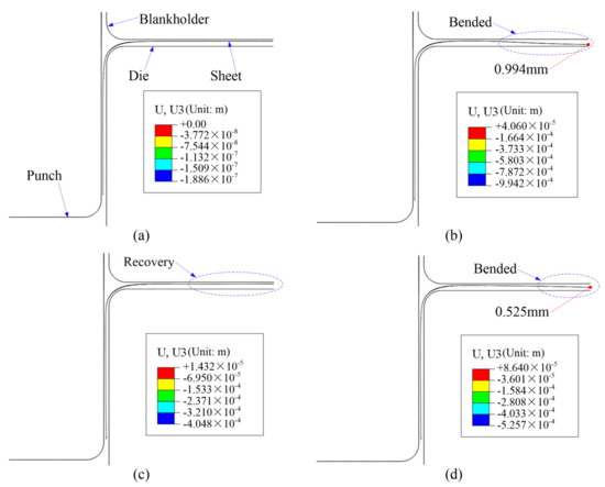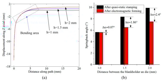 Figure 11 shows deformation profiles and springback angles after quasi-static stamping and coil discharge for different distances (h) between the blankholder and die. Two observations can be made: (1) A smaller h results in a smaller bending radius after stamping, as shown in Figure 11a, and it leads to a smaller springback angle after quasi-static stamping; (2) A larger h results in greater differences between the springback angle produced by the coil discharge and quasi-static stamping. If h is 1 mm, there is almost no displacement along the X and Z-axis at node 3067, which leads to almost no inhibition of springback after the coil discharges. If h is 1.5 mm or 2 mm, the coil discharge clearly has much greater inhibitory effects on the springback compared to quasi-static stamping. This suggests that the springback reduction after coil discharge is related to the sheet shake.