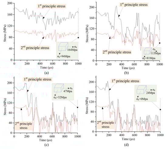 Principal stress vs. time after coil discharge for a discharge voltage of (a) 5 kV, (b) 6 kV, (c) 7 kV, and (d) 7.5 kV.