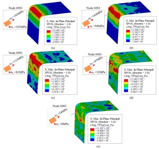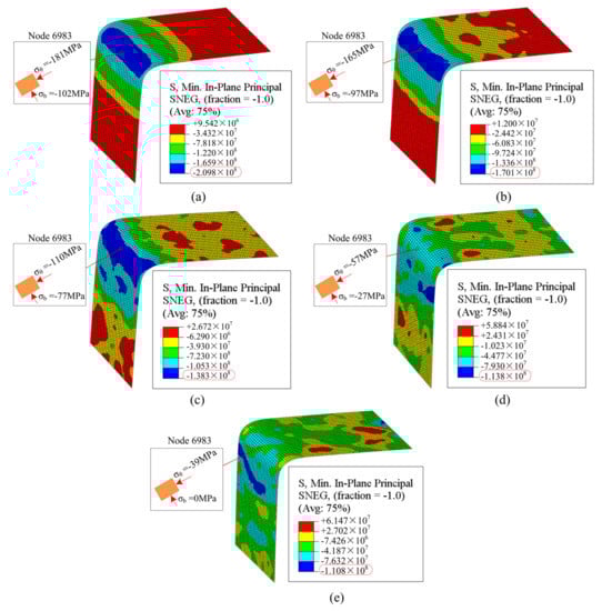 The distribution of tangential stress on the inner layer of sheet metal at different discharge voltages is shown in Figure 16. Larger discharge voltages result in a more uneven distribution of tangential compressive stress in the inner layer, whereas the maximum tangential compressive stress is smaller and occurs at the straight-edge area of the metal sheet.