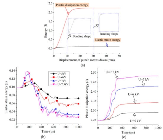 Figure 17 shows the changes of elastic strain energy and plastic dissipation energy with time during the quasi-static stamping and EMF process. The greater the elastic strain energy, the larger the springback. As shown in Figure 17a, the elastic strain energy and plastic dissipation energy after quasi-static stamping are 0.0985 J and 2.24789 J, respectively. As the discharge voltage increases, the plastic dissipation energy increases, while the elastic strain energy decreases. Thus, the springback angle should decrease more rapidly with the increasing of discharge voltage after the EMF.