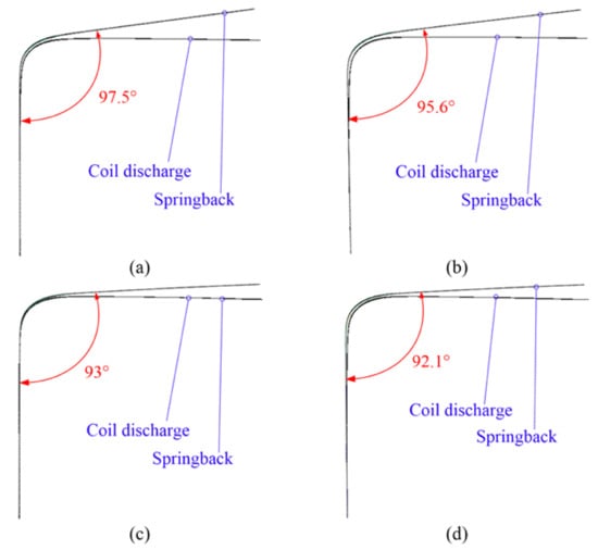 Springback angle from the front view after a coil discharge of (a) 5 kV, (b) 6 kV, (c) 7 kV, and (d) 7.5 kV.