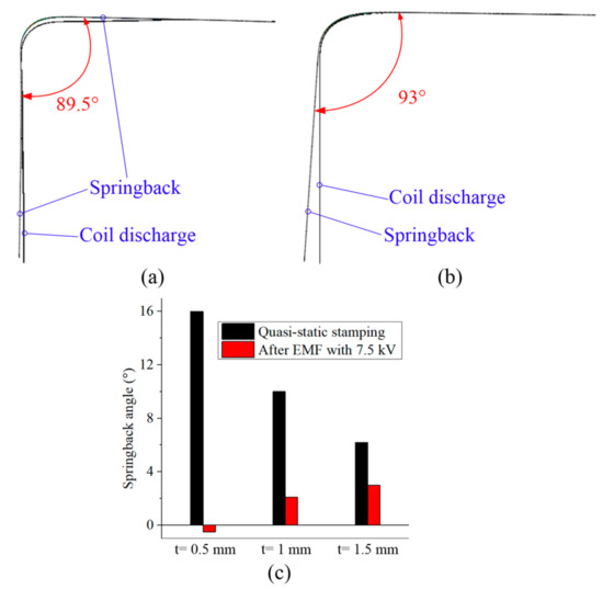 Springback angle with different sheet thickness: (a) the sheet thickness is equal to 0.5 mm and its deformation shape, (b) the sheet thickness is equal to 1.5 mm and its deformation shape, (c) comparison between the quasi-static stamping and EMF.
