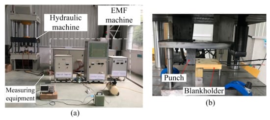 Experimental setup: (a) EMF machine and measurement equipment, (b) metal forming module.