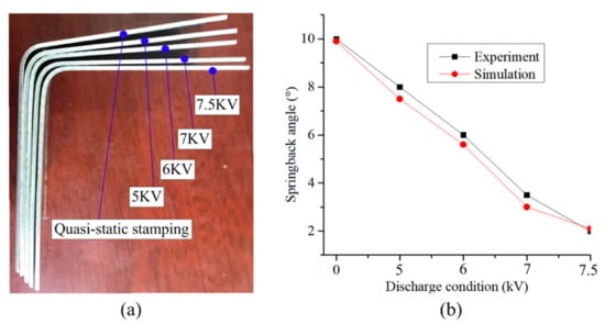 The springback values obtained experimentally for different coil discharge voltages are presented in Figure 21a, and the experimental springback angles are compared to the simulated values in Figure 21b. With the discharge voltage increases, the springback angle gradually decreases. The simulation results can better describe the changes in the springback angle of the metal sheet after the coil discharges.