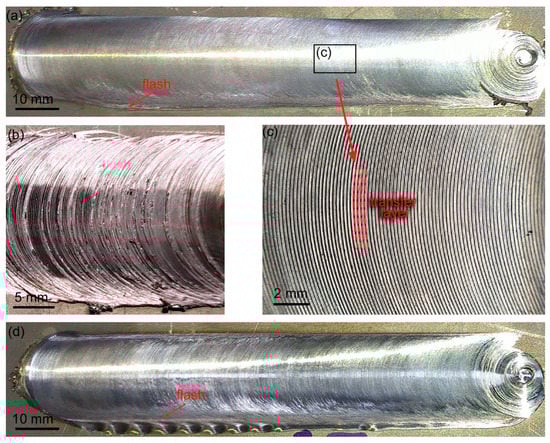 The first criterion in finding the welding parameters is the appearance of the welds. The weld should not contain visible defects, such as surface grooves and excessive flash. Both of these defects reduce the cross-section of the weld and its strength. The top surface of the weld should be relatively flat. Because welding is performed layer by layer, transfer layers are formed on the top surface in the form of adjacent arcs. These layers should be clearly distinguishable and have periodicity; for example, Figure 2a shows the appearance of weld no.8 without significant visible defects. On the top surface of this weld, a periodic morphology of the transfer layers could be distinguished (Figure 2c). Figure 2b shows the appearance of weld no.5, which had a highly irregular surface. All the produced joints did not contain surface grooves. Visually, a decrease in weld thickness and flashes were detected (Figure 2a). Figure 2d shows the appearance of sample no.4; this sample was characterized by an excessive flash. Both defects were, as a rule, interdependent since a part of the weld material was extruded and formed flashes. A higher load improved the appearance of the joints—the front surface appeared smoother. A further increase in the load led to flashing. The increased rotation rate resulted in a smoother surface but decreased torque, which is indicative of weaker adhesion and overheating, and was accompanied by flashing. An increase in the feed rate had little effect on the external quality of the joints but led to a gradual growth in torque and longitudinal force. In addition, these characteristics became less stable during the welding process, though their stability was an important criterion of the joint quality at the stage of rough selection of the mode. Based on the appearance as well as force and torque characteristics, mode no.4, no.8, no.9, no.12 and no.13 joints were chosen for further study. These joints had an acceptable appearance and the most stable characteristics of torque and longitudinal force.