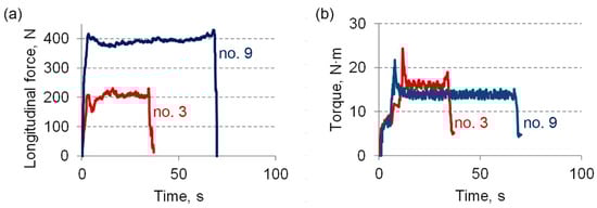 Dependence of the longitudinal force (a) and torque (b) on the FSW time in modes no.3 and no.9.