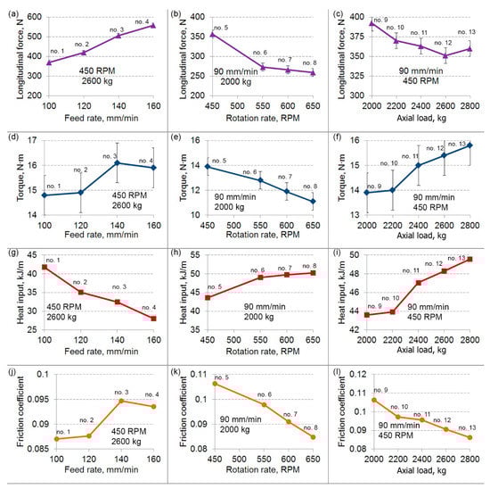 Effect of feed rate (a), rotation speed (b) and axial load (c) on the longitudinal force in modes no.1–4, no.5–8, and no.9–13 respectively; Effect of feed rate (d), rotation speed (e), and axial load (f) on torque in modes no.1–4, no.5–8, and no.9–13 respectively; effect of feed rate (g), rotation speed (h), and axial load (i) on heat input in modes no.1–4, no.5–8, and no.9–13 respectively; effect of feed rate (j), rotation speed (k), and axial load (l) on friction coefficient in modes no.1–4, no.5–8, and no.9–13, respectively.