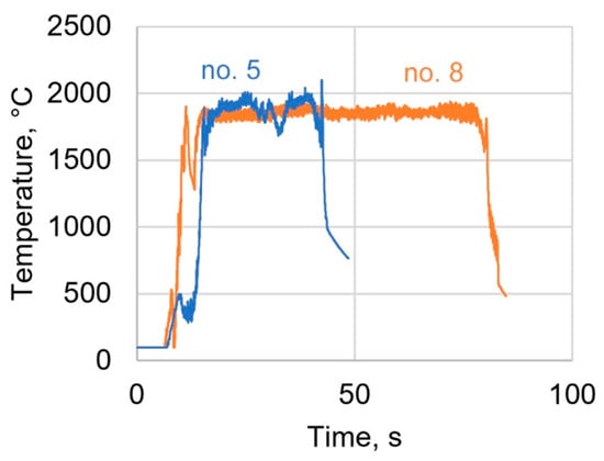 Mode no.8 had the highest stability of heat input during welding (Figure 5). The rest temperature diagrams illustrate irregular heat input and an increase in heat input during welding. The thermogram of sample no.5 is shown for comparison. Thermal stability assumes better quality of joints. No correlation was found between temperature and process conditions. In addition, the measurement error due to large temperature jumps did not allow comparison of average temperatures. For this reason, temperatures for each mode are not shown here.
