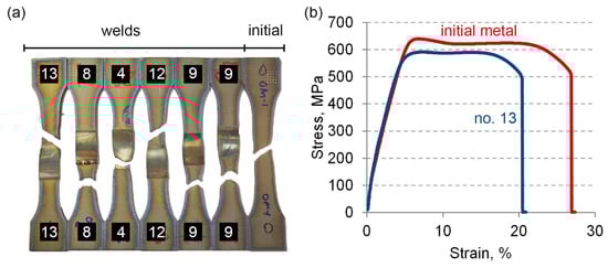Appearance of welded specimens no.4, no.8, no.9, no.12, and no.13 after mechanical tests (a) and characteristic stress–strain diagrams of initial metal and weld no.13 (b).