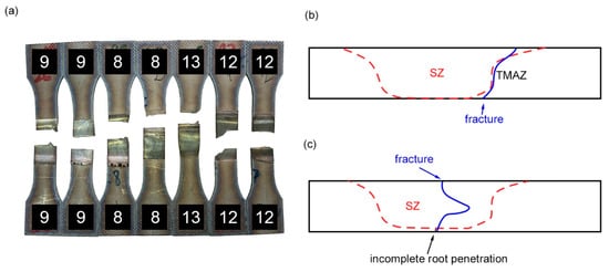 These specimens were also tested for fatigue strength. Figure 7 shows a typical appearance of the specimens after fracture. Most of the specimens were fractured along the boundary between the stir zone (SZ) and thermomechanically affected zone (TMAZ; Figure 7b). The strongest specimens welded in modes no.13 and no.8 failed outside the weld. Mode no.13 welds showed abnormal fatigue strength, several times higher than that of the base material. Since this mode had the highest load, it can be assumed that the abnormal strength was related to the effects of residual stress. All three types of mechanical tests showed that the mode no.13 specimen was the strongest. This mode had the highest axial load on the tool and provided the highest torque of specimens. Mode no.3 and no.4 specimens had the same high torque in welding but much lower heat input, which would not allow for high-quality welds. Mode no.4 showed root opening during bending, which can be considered a defect. In these samples, incomplete root penetration was found; therefore, the fracture occurred along it. The fracture diagram is shown in Figure 7c.