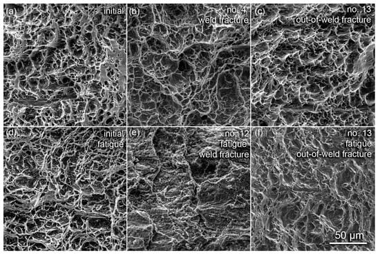 Figure 8 shows fractographic images of specimens after mechanical tensile and fatigue tests, which are given on the same scale. In most cases, ductile failure was observed. Brittle failure was observed in specimen no.12, which fractured at the weld during fatigue testing. Being typical of fatigue fracture, the brittle pattern was not met outside the weld. This may indicate a high crack velocity in the stir zone due to its refined equiaxial structure []. In this case, individual transfer layers could be distinguished, which had delaminated and been destroyed during the test. No other deviations from the normal fracture behavior of a material were observed.