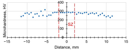 Figure 9 shows the microhardness graph of sample no.12. The microhardness was measured along the middle line of the weld (Figure 10). This measurement was made to determine the boundaries of the zones. Results of measurements have shown that in the sample no sharp fluctuations of microhardness were observed. Single high values of microhardness outside the weld were related to the features of the alloy itself; it is possible that there were grain boundaries or metallurgical defects in these areas, which is permissible for rolled sheets. Further microhardness was measured in specific areas.