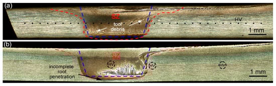 where Fz is the axial load and Rs is the shoulder radius. This expression was obtained from the Coulomb model [] and enables an estimation of the average friction coefficient via the average torque. Actual values of the friction coefficient, as well as of the torque, are different at each point of the tool surface. In areas with considerable adhesion, the friction coefficient exceeds unity, while, in other areas, slip occurs. The shoulders are thought to contribute mostly to material heating, as they are provided with slip conditions and have a larger area than the pin. In addition, the shoulder rate is higher than the pin rate. The pin makes a great contribution to the transfer of the material where uniformly constrained conditions arise. The same is confirmed by optical images of weld cross sections (Figure 10), exhibiting slight deformation of the material under the shoulders. In this case, an average friction coefficient may indicate the state of the entire system.