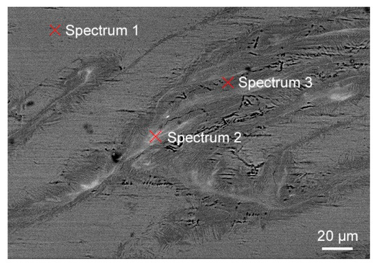 Figure 10 shows the weld macrostructure. The blue dashed line shows the tool pin contour. The macrostructure was typical of friction stir welds, but had special features. The stir zone was equal to the area of direct contact with the tool. In general, the shape of the stir zone followed the tool shape. The TMAZ was extremely narrow (about 0.2 mm), and therefore it is not indicated in the image. A heat affected zone was not found either by visual inspection nor in microhardness measurements, which however exist in aluminum alloys []. This feature is typical for other titanium alloys, e.g., Ti–6Al–4V []. It is supposed that the absence of the thermal affected zone is due to the low thermal conductivity of titanium alloys. A light layer of titanium alloy was observed in the stir zone subsurface. This layer is formed due to the low thermal conductivity and low ductility of the alloy, even at high temperatures. An area left behind the pin continues to experience pressure and friction due to the shoulders, and the material in this area is still under shear. Titanium alloys have very low thermal conductivity (21.9 W/(m⋅K)) in contrast to aluminum alloys (237 W/(m⋅K)). Slow heat removal leads to additional local heating and repeated recrystallization, which is accompanied by grain coarsening to the size of the base metal grains. Due to shear, localized deformation bands were formed in this area. These bands are not in fact defects, being revealed only by etching. Similar effects were observed in the lower part of the stir zone, where the material experienced vortex motion due to shear induced by the edge of the pin. Most of the joints had no macrodefects, but there was incomplete penetration in weld no. 4. Near the weld root and at the stir zone boundary on the advancing side, tool debris was observed. Wear debris has also been found in commercially pure titanium joints []. With adhesive wear of a tool, its particles are mechanically mixed into the joint, where they diffuse and form new compounds, which are well-detected by etching. So far, there is no understanding as to whether this is a defect. If these particles harden the weld, the stir zone can be considered a matrix composite. An energy-dispersive analysis was performed in this area. The results are shown in Figure 11 and Table 4. Tool debris are represented as light contrasting objects. Analysis of these objects showed that they had elements contained only in the tool (Cr, Co, Ni, W). Outside of these objects the chemical composition of the alloy corresponded to the grade composition.