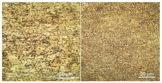 Since Kroll patented a simple magnesium–thermal method of reduction of metallic titanium from its tetrachloride in 1940 [], titanium alloys have been widely used in production. Now they are used in the aerospace, military, chemical, medical, and shipbuilding industries. This is due to a number of useful properties, such as corrosion and heat resistance, high specific strength, and biocompatibility. Titanium alloys are classified into high-strength (consisting of β phases), medium-strength (consisting of α + β phases), and highly ductile alloys (containing only α and sometimes α’ phases).