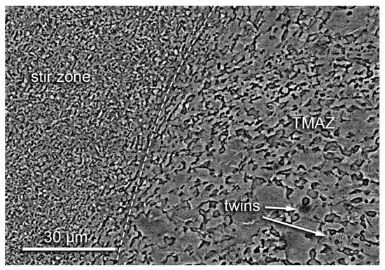 Figure 13 shows a backscattered electron SEM image of the boundary between the stir zone and TMAZ. The boundary between the zones is sharply gradient. TMAZ did not exhibit elongated grains as found in aluminum alloys []. This was probably due to its lower thermal conductivity and higher strength. Twins were found in some grains, which are indicative of deformation in this zone.