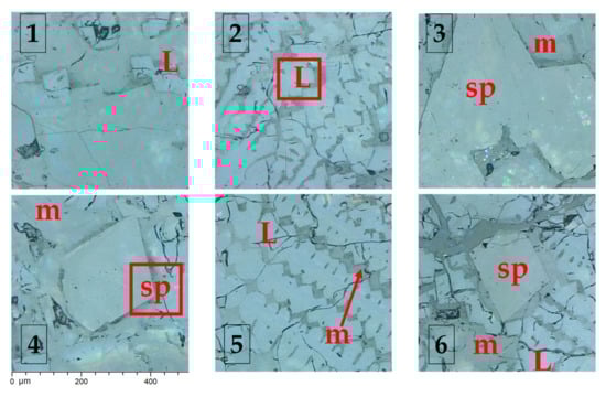 Overview optical microscopy images of six different positions of the sample. L: Li-aluminate, m: matrix (MCAS, sp: spinel (ss). Red squares: regions of interest (ROI) (see text).
