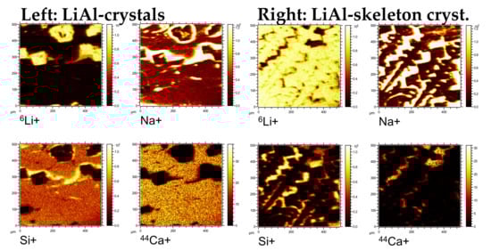 The qualitative SIMS element imaging carried out on the material, as already described by Schirmer et al. [] and Wittkowski et al. [], verifies the incorporation of Li into the siliceous (melilitic) matrix, LiAl, and spinel. The ELAS, forming small inclusions in the massive LiAl crystals (Schirmer et al. []) was not detected with SIMS.