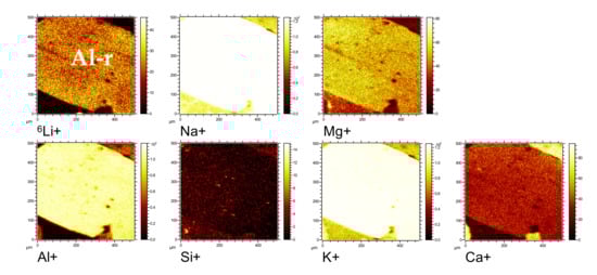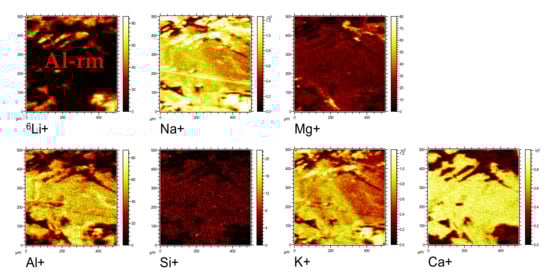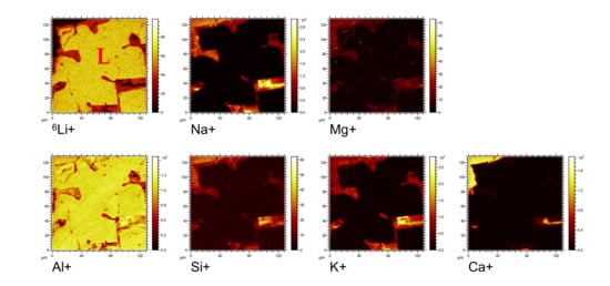 To map the spatial distribution of the emitted elemental SI (beginning with H) and the characteristic elements (e.g., Li, Si, Al, Mg, Mn), the primary beam was used to scan an area of maxiumum 500 × 500 mm2 using a pixel resolution of 128 × 128 or 256 × 256. If necessary, a higher lateral resolution (200–400 nm) can be achieved using a different operational mode of the LMIG, in cases where the lower detection sensitivity and mass resolution of this mode are acceptable. Because of the complex mechanism of SI emission in contrast to other analysis methods (e.g., EPMA), a direct quantification of the measured SI intensities is very difficult. Therefore, all images presented in this study only display intensities, rather than concentrations.