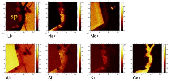 A detailed view of lateral intensity distributions of selected positive isotope-resolved secondary ion signals of a spinel crystal (specified in Figure 1, red square at position 4, named “sp”) is presented in Figure 4. While the distribution of Al seems to be homogeneous, the crystal shows a depletion of Li at the rim. Additionally, remarkably, there is a slim line, which is translatable to a crystal plane where the depletion of Li is increased and correlates with an increase of the Mg signal. The sharp rim of the spinel crystal is surrounded by a silicate matrix with patches enriched in Na and K. In these patches, Li is incorporated, as well.
