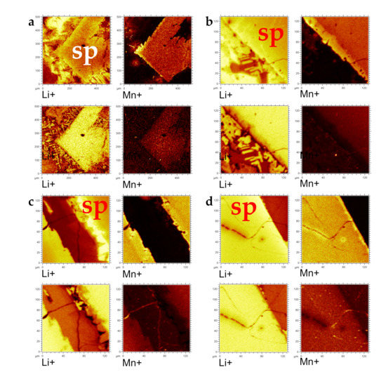 (a–d) Details of the lateral intensity distributions of selected positive isotope-resolved secondary ion signals of spinel (ss) grains (sp) depicting the relation of Li, Al, Mn (and Mg).