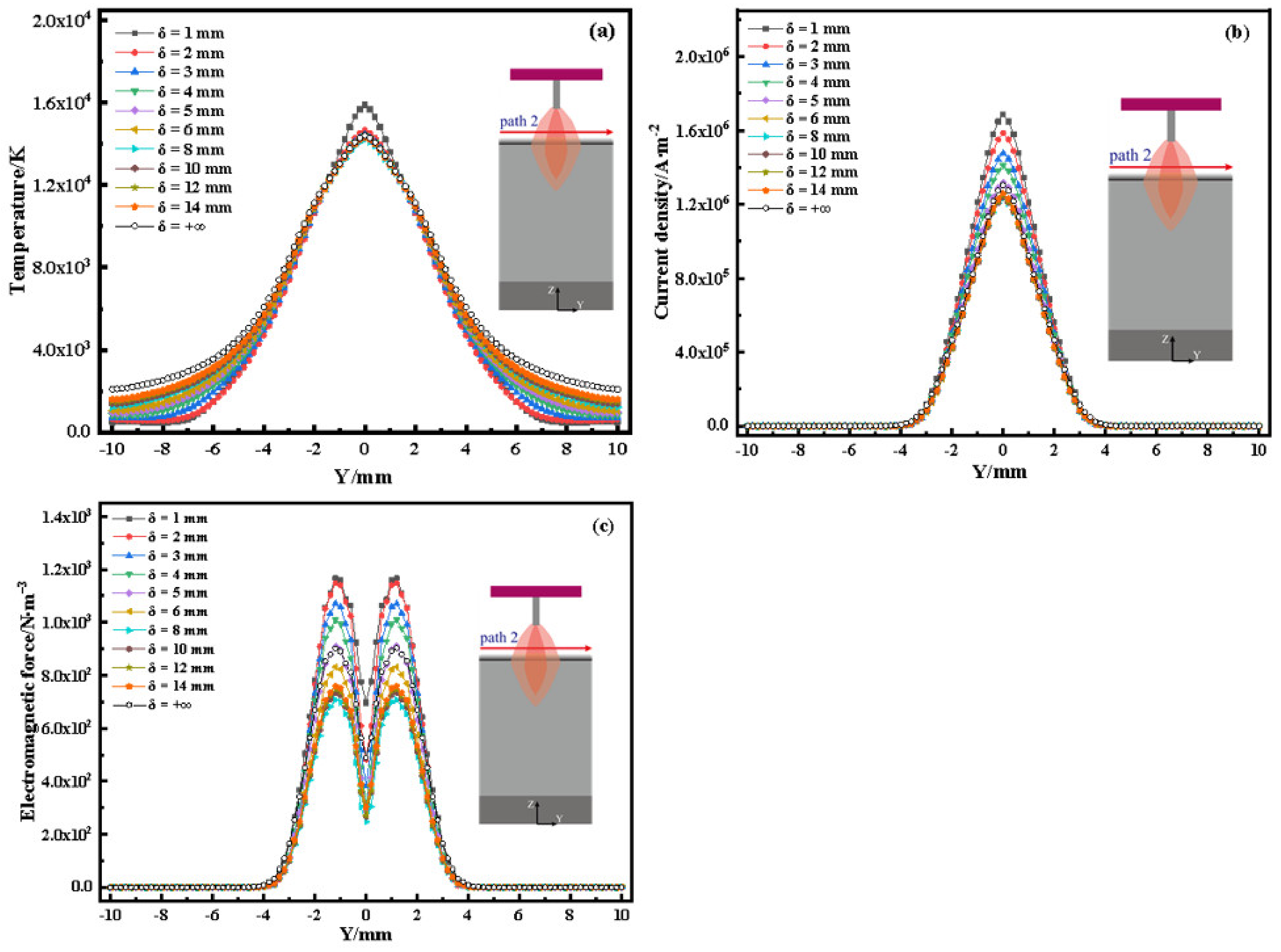 - When δ > Φ, the peak temperature of the arc centre, the peak current density, and peak and valley electromagnetic force along the welding direction increase slowly with the increase in wall thickness, and similar to the case of plate welding, the small cathode area on the top surface of the wall will lead to a weak trend of the arc contraction.