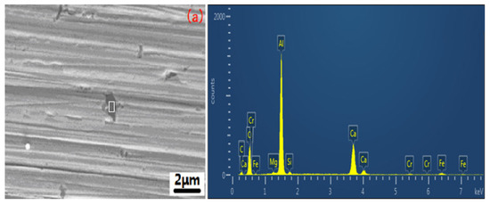 When the SECM test was over, the micromorphology of the samples was observed by a scanning electron microscope. The results showed that pitting corrosion firstly occurred in inclusions. The morphology of the inclusions includes strip (Figure 5a,b) and round inclusions (Figure 5c,d). The area containing strip inclusions on the surface of the sample displayed serious pitting corrosion. It should be known that the inclusions were oxide inclusions of the aluminum and FeAlx phase according to the analysis of the energy spectrum (EDS) test. Table 1 shows the EDS results of the inclusions from Figure 5a–d.