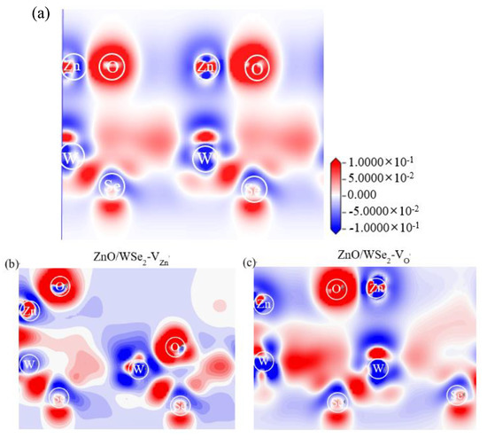 At the same time, we compared the electron density difference before and after vacancy generation, as shown in Figure 6. Blue represents charge depletion and red represents charge accumulation. It can be seen from the figure that there is a certain rule of charge depletion and accumulation. There is charge depletion near Zn and W atoms and a large amount of charge accumulation around O and Se atoms. Among them, the charge distribution around each monolayer atom in ZnO/WSe2 heterostructure is similar, and there are charge depletion and charge accumulation between monolayers. After the relaxation, due to the absence of a Zn atom, the not bound O atom moves to the WSe2, resulting in a great change in the structure of the ZnO. At the same time, the charge accumulation around the O atom also leads to an increase in the charge depletion around the W atom. That may be the reason why the vacancy formation energy of ZnO/WSe2−VZn is negative. However, the formation of the O, W, and Se vacancies has little effect on the structure of each monolayer, and the charge distribution is regular. Among them, the formation of the O vacancy has the least effect on the structure and charge distribution; After the Se vacancy is generated, the interlayer spacing between WSe2−VSe and ZnO is greatly reduced, the charge accumulation and consumption between layers are increased, and the interlayer bonding is more stable, which is the same as the calculation results in Section 3.1. vacancies will change the electronic structure of ZnO/WSe2 heterostructure and then affect the optical properties. Therefore, it is necessary to study the optical properties of ZnO/WSe2 heterostructure.