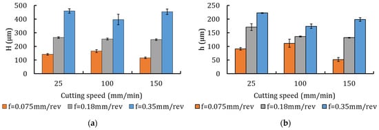 The measured chip morphology parameters are summarized in Figure 3. An increase in all parameters was observed as the feed was increased. The increase in cutting speed shows a little effect on and (Figure 3a,b), but a slight increase in and (Figure 3c,d), i.e., the segments are more spaced. This is not the case of the lowest feed, for which the chip segmentation is aperiodic. Irregular segments are formed, corresponding to variable geometry parameters along the chip. There is no clear trend (increase or decrease) of chip parameters as cutting speed increases. The complex interaction between the work-hardening (dominant at low speeds) and work-softening (dominant at higher Vc), mainly in the formed localized shear bands, leads to such variations. In the next section, more insight on the mechanism of chip formation (interaction of damage occurrence and microstructure change) is addressed.