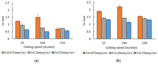 Evolution of compression ratios with cutting condition: (a) Cr-min; (b) Cr-max; (c) Cr-mean.