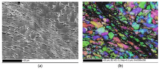 The microstructure of one selected chip is shown in Figure 8, and attention was paid to the ASB and phenomena occurring in this area. Two features are especially interesting: (i) the deformation of grains by elongation, which provides key information on the ductility of the material during the shearing process leading to the chip formation and (ii) the presence and extent of cracks, which provides information on damage mechanism. In Figure 8, the ASB is constituted by a crack and localized plastic deformation area. The crack starts from the chip-free surface and propagates toward the chip surface in contact with the tool rake face. This observation is in accordance with other results, such as those obtained by Hua and Shivpuri []. It was noted that there was a low plastic deformation around the cracks occurring in the ASB, meaning a lack of ductility. The gap of ductility between the inside and outside of ASB revealed a difference in the thermo-mechanical loading in the chip, namely the amount of temperature, strain rate, and hydrostatic stress.