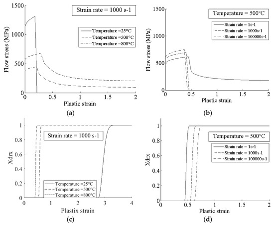 Figure 11a illustrates how the temperature affects the material flow stress for strain rate set to 103 s−1. Three temperatures are chosen (25, 500, and 800 °C). At a room temperature of 25 °C, the material undergoes low plastic strain up to fracture. For higher temperatures, the material undergoes dynamic recrystallization and high deformation. Figure 11c shows the corresponding recrystallized volume fraction evolution with temperature. For a low temperature (25 °C), the critical strain is elevated. The rate of recrystallization is also lower compared to the other cases. With an increase in the temperature (here 500 °C and 800 °C), the critical strain decreases, and the recrystallization rate is higher. Since DRX is a thermally activated phenomenon, this evolution was expected. Figure 11e shows the associated damage evolution. The plastic deformation at damage initiation increases with temperature. At higher temperatures (800 °C), the damage does not occur since recrystallization occurs first, which deactivates the damage.