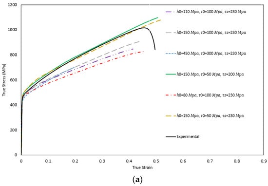 Sensitivity analyses need to be carried out to calibrate coefficients including the initial hardening modulus (), stage-I stress () and initial shear stress (). By using a single crystal material SS 316 L with FCC structure [39], a good agreement can be found between experimental and numerical curves obtained based on two sets of input parameters, as is illustrated in Figure 11a. By running several tests according to Figure 11b, and taking into the account that the RVE model containing 199 grains has a lower initial shear stress compared to the single crystal, the value of produced the closest match to the experimental stress strain graphs and can be used henceforth. The influence of the parameter on the calculated tensile curves determines the inclination and the curvature of the graph in the plastic region. Higher values of this parameter result in steeper curves; however, changing this value has little effect on the position of the maximum applied force and the value of is selected for this material behavior. Reference stress defines the onset of the large plastic deformation and its variation affects the length of the linear part of the curve beyond the yield point. Table 1 shows the calibrated hardening values based on the Bassani–Wu hardening rule using the present CP model.