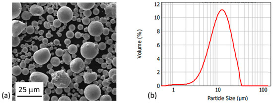 (a) SEM micrograph of 316L particles formed by gas-atomization. (b) Particle size distribution of those 316L particles.
