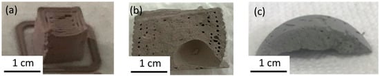 To limit these air pockets, the calendaring process, using silicone molds, provided an alternative that did not result in large gaps within the material. A proper degassing procedure was not successful in preventing air bubbles, so even material formed with molds (cf. Figure 2c) had air pockets, but these were smaller than the printed material. The error caused by these air pockets on the final densification was not quantified. The paste formulations used in this study are extrudable and can be printed into a desired shape. A degassing procedure still needs to be defined and the relaxation of the paste needs to be improved to decrease the initial porosity.