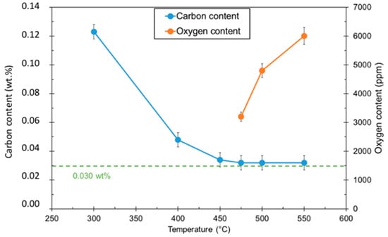Large increases in dwell time may result in improved C removal, but excessively long dwell times become impractical for industrial application. Instead, the decision was made to use an oxidizing atmosphere at a lower temperature to remove the remaining C. Heat treatments were conducted at a constant dwell time for different temperatures. The amount of oxidation was measured by determining oxygen contents after treatment. The C content was also measured to determine the amount of removed C. The samples were placed under Ar/1%O2 for 180 min. Results for different temperatures are shown in Figure 3.