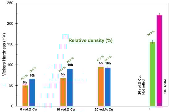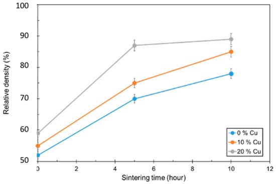 Relative density and density of 316L, 316L + 10% Cu, and 316L + 20% Cu samples for three annealing times (0 h, 5 h, and 10 h).