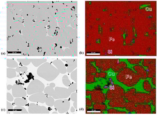 (a) 10 vol.% Cu BSE micrograph, (b) 10 vol.% Cu EDS map, (c) 20 vol.% Cu BSE micrograph, (d) 20 vol.% Cu EDS map. For EDS maps, Fe is red, Cu is green, and silicon is pink.