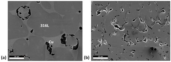 Excessive pores may also be the result of insufficient liquid amounts. One study showed that a content of 25 vol.% Cu was required to obtain adequate densification properties []. It also included an addition of tin, which the study stated improved the mechanical properties. A study of the content and composition of the liquid can be continued.